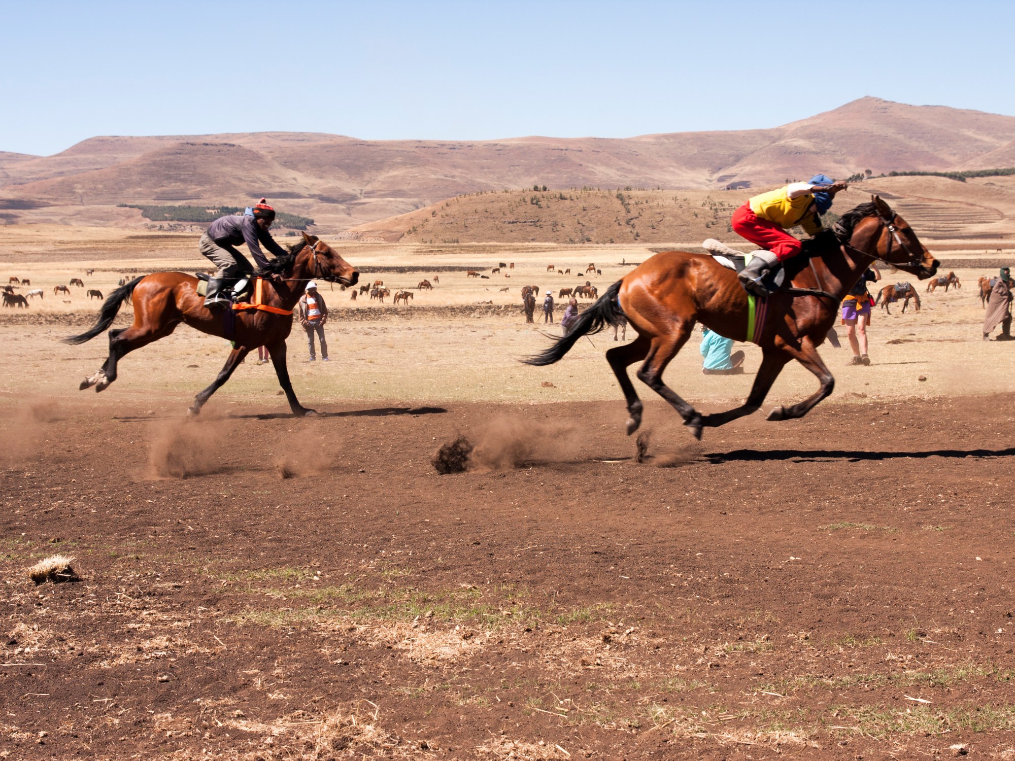 “Bo-Ntate, you need to move your cars, that is the finish line.” Standing in a brown field surrounded by mountains, Basotho and horses, we didn’t realise that the two piles of white painted rocks were the finish line.